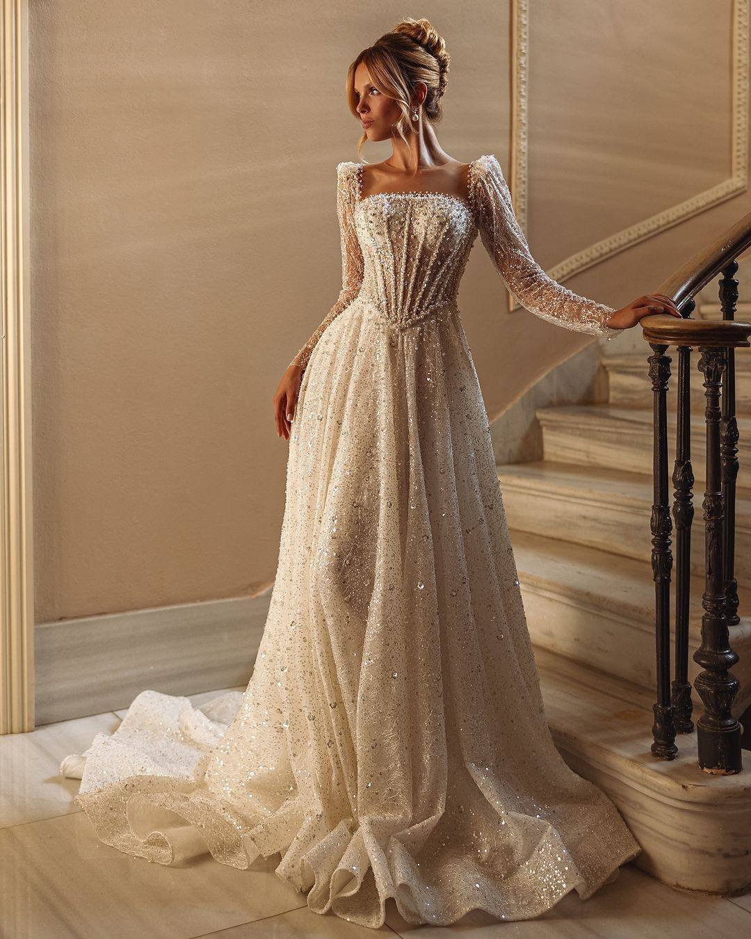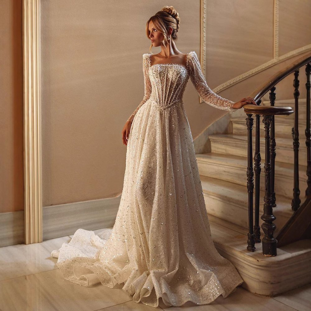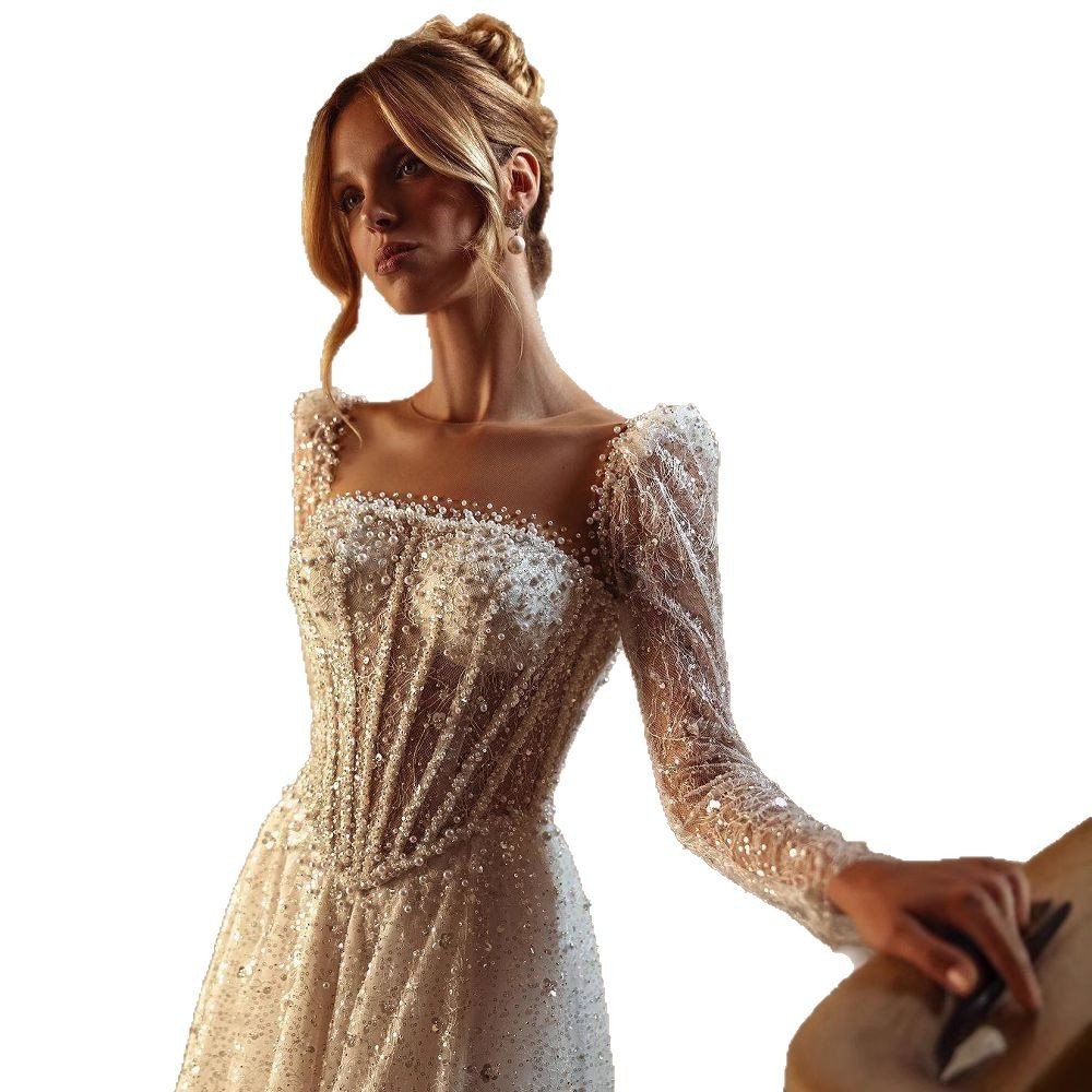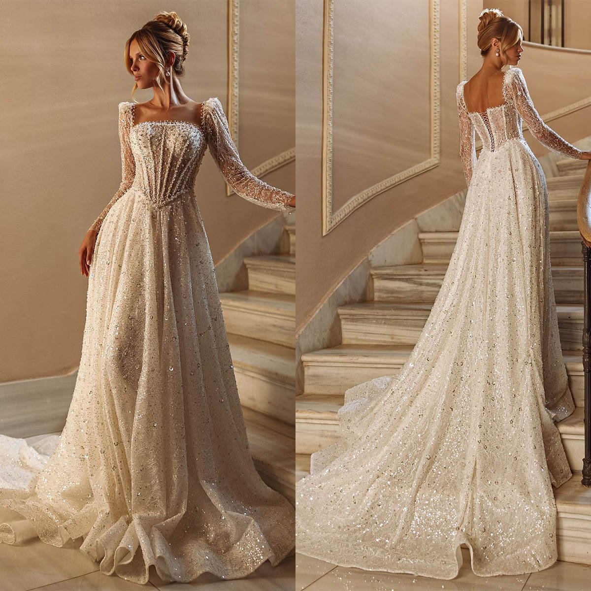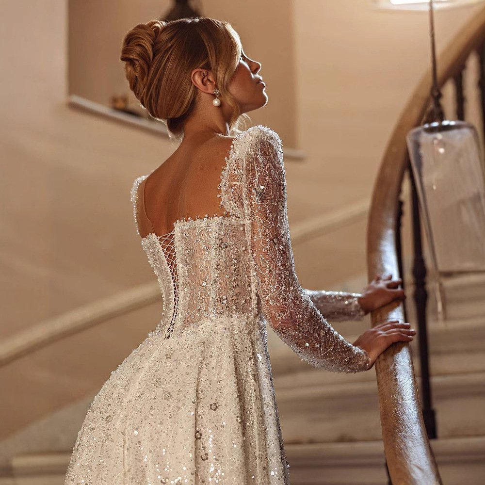 Smilprince Wholesale Sequin Prom Dresses – Dreamy A-line Sequin Lace Floor-length Backless Long Sleeve Elegant Bridal Gown Vestido De Noiva